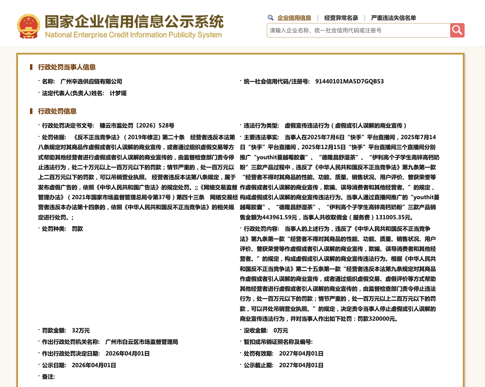 今日广州辛选供给链无限公司果伪善宣扬背法活动,被广州市黑云区商场监视办理局奖款32万元。
